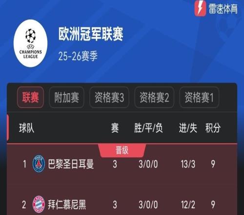 欧冠第3轮后积分榜:巴黎拜仁等5队全胜,巴萨利物浦积6分