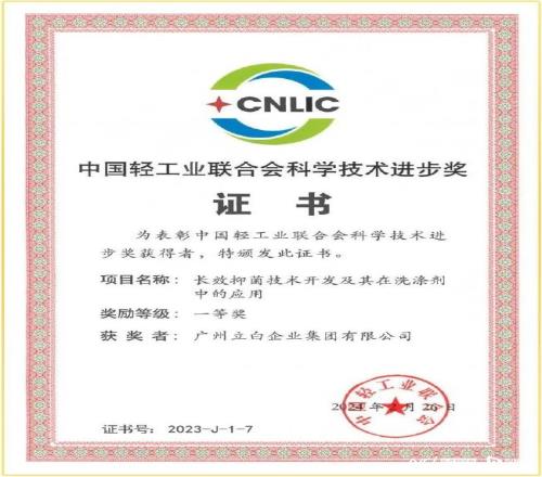 立白卫仕长效抑菌技术荣获“中国轻工业科技进步奖一等奖”。
