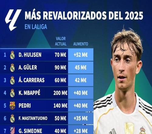 西甲2025年身价涨幅TOP15:赫伊森上涨5200万第1,姆巴佩第4